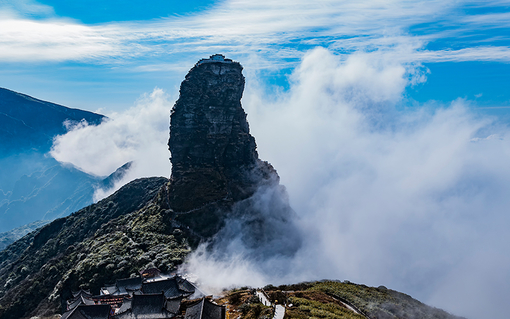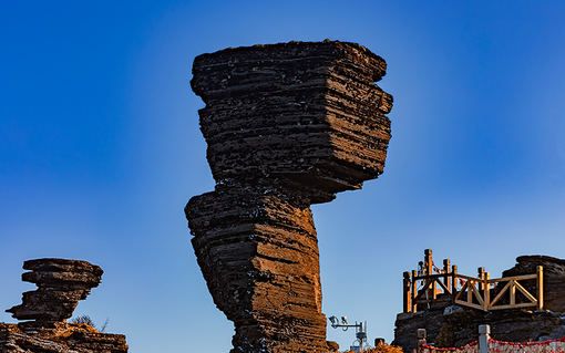 蘑菇石梵净山标志性景点。其名字就如形象一样,上大下小,酷似蘑菇。蘑菇石高约十米,亭亭玉立,看似一触即倾,其实岿然不动(它已经在风霜雨雪中飘摇了10亿年以上),在蘑菇石旁,瞭望对面的红云金顶时,仿佛能听见它们在述说这亿万年间的情怀。