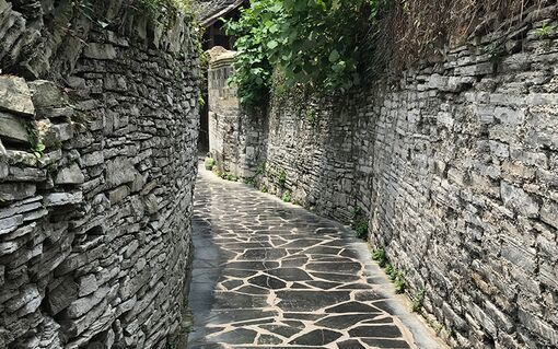 街道两边还有层层片石垒砌的院墙,路窄而幽静,沿山势起伏,是摄影的好地方
