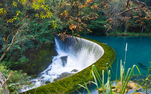 瀑布前的犀牛潭被溅起的水珠覆盖,轻柔的水雾构成一幅泼墨画