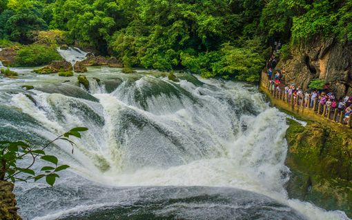 沿着栈道边走边欣赏瀑布流水奔腾涌流,壮观异常