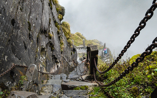 相对来说红云金顶较为险峻,有的地方90度垂直,没有阶梯,需要抓着铁链爬上去