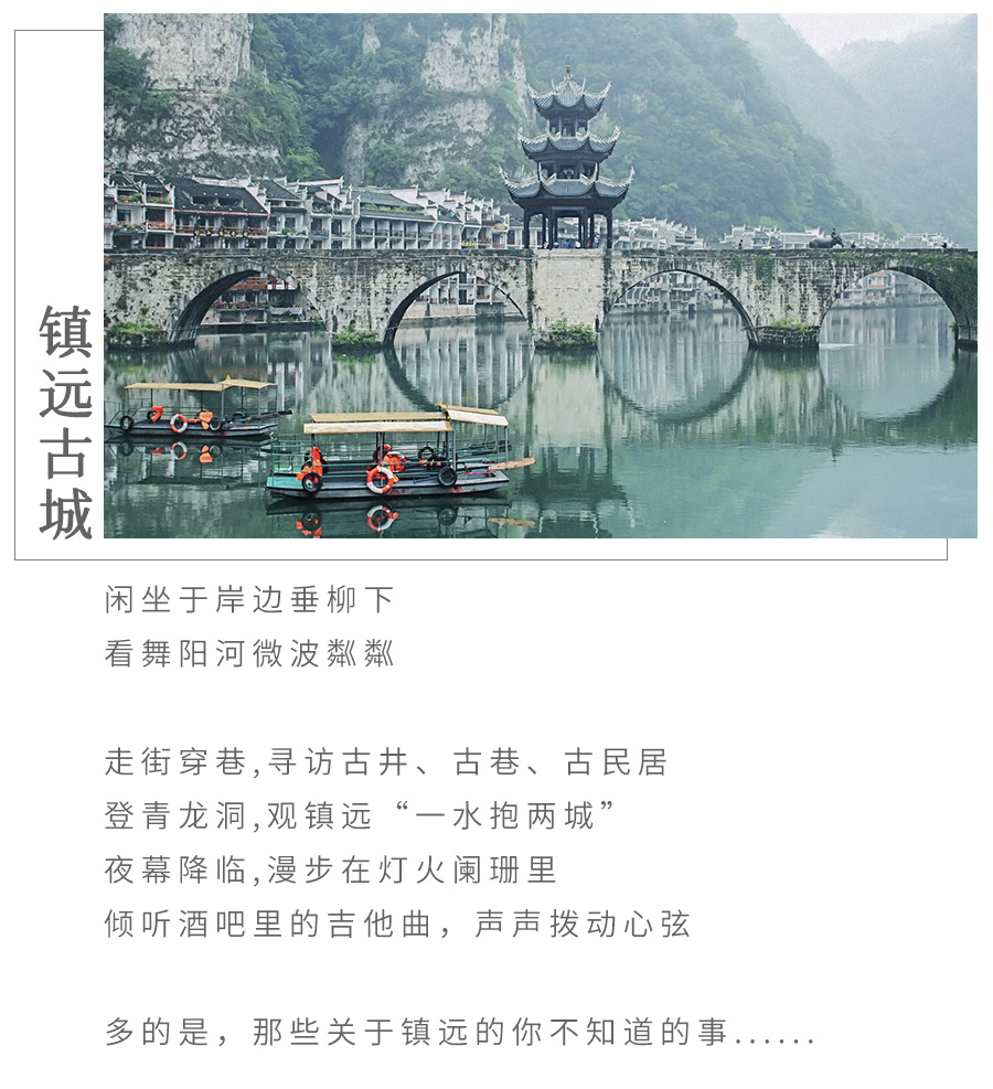 早晨可以开始在镇远的行程,探寻古井、古街、古牌坊,赏舞阳河风光,登青龙洞,下午驱车前往贵阳,结束行程
