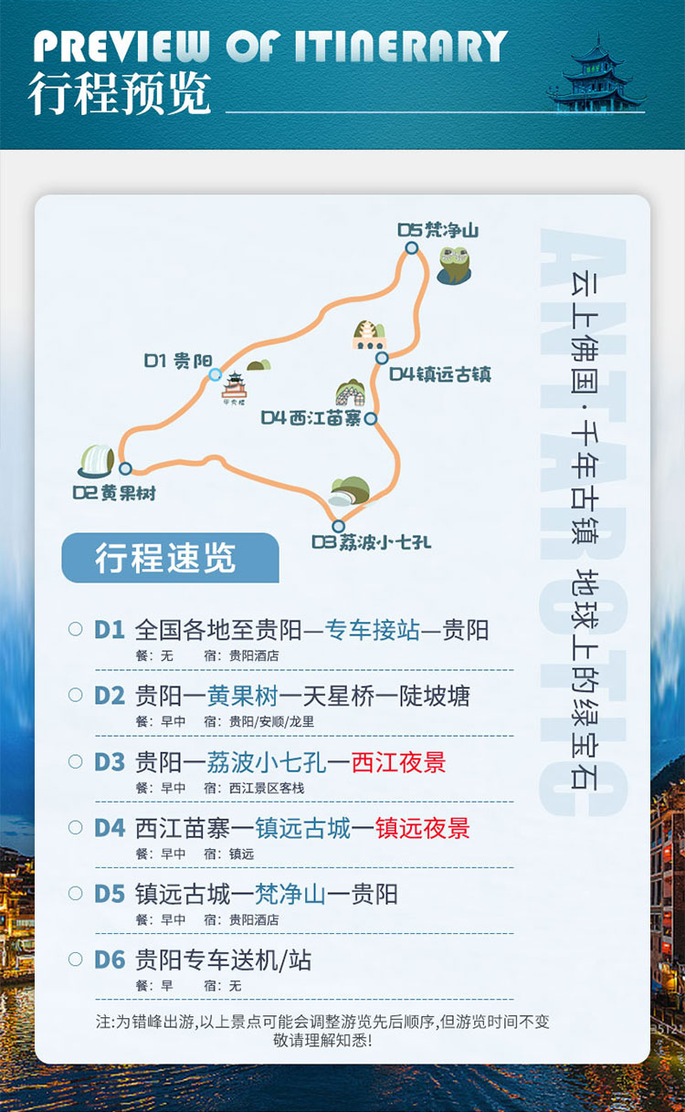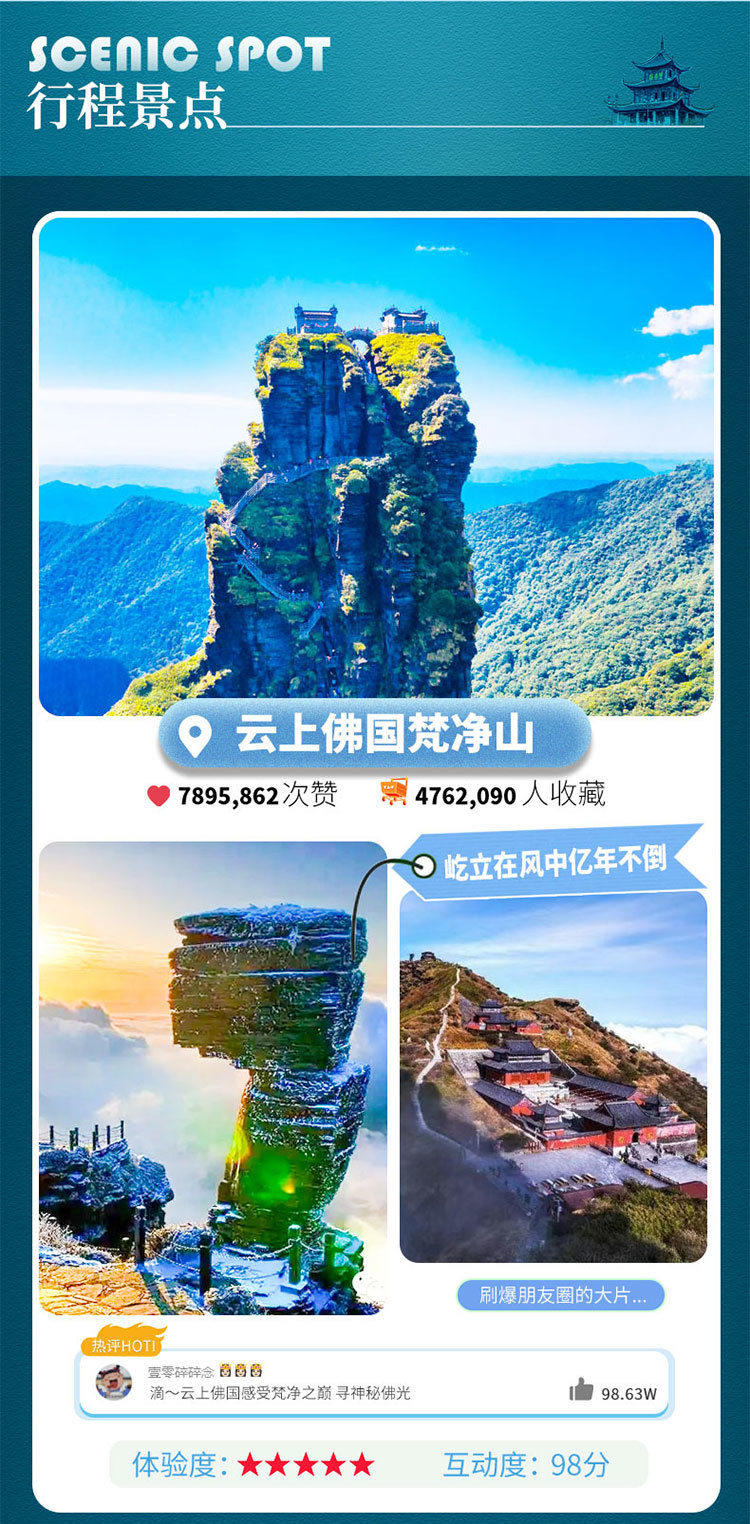 备注:梵净山是武陵山脉主峰,海拔较高。一年四季峰顶气候和山下有较大差异,如因有暴雨、降雪、凝冻、大风等不可抗力因素导致景区临时性关闭,团队将调整行程为亚木沟景区,费用无增减。敬请知悉!!