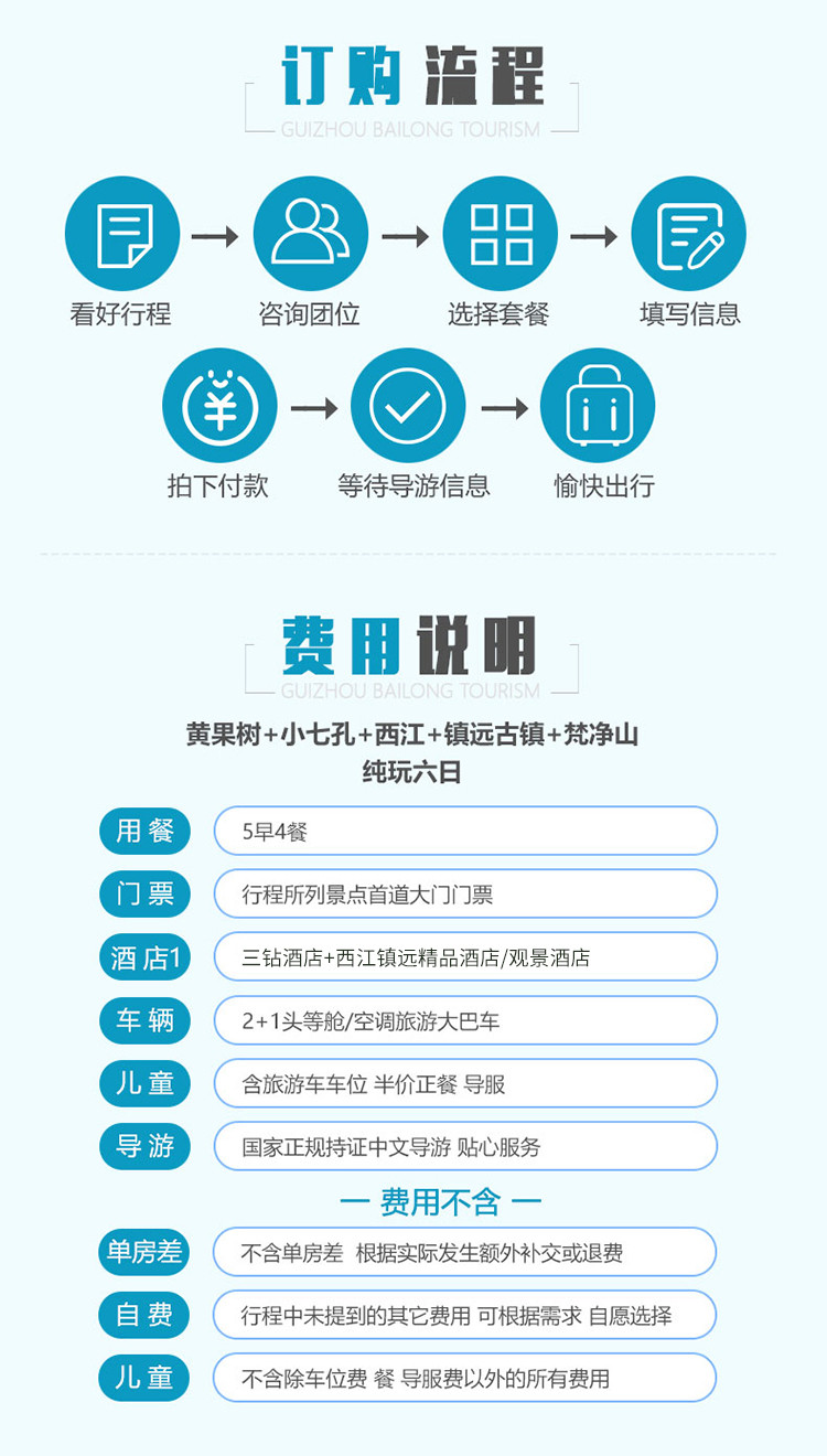 景区内自费项目:不含黄果树大瀑布扶梯单程30元/人、双程50元/人、天星桥索道10元/人,小七孔鸳鸯湖游船30元/人,镇远古城内青龙洞景区60元/人属景区内自愿选择消费项目,可根据个人需要自愿选择消费。