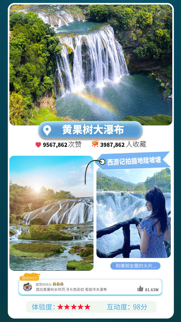 它位于黄果树瀑布上游,陡坡塘瀑布还有一个特殊的现象:每当洪水到来之前,瀑布都要发出轰隆、轰隆的吼声,因此又叫吼瀑。1983年版西游记片尾曲拍摄地带您追忆唐僧师徒四人取经的经典。