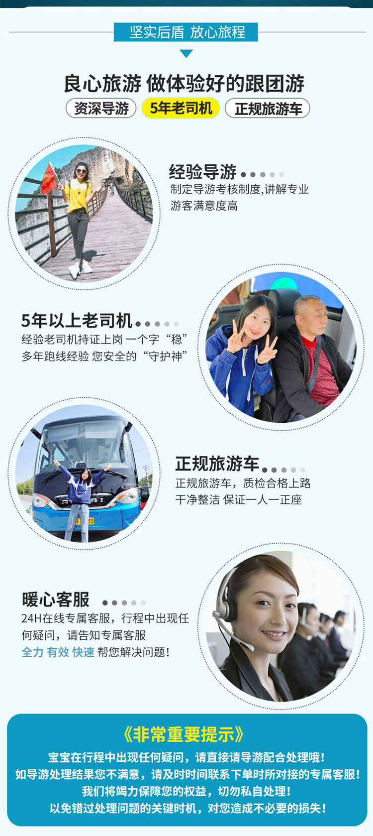 4. 导游会在入住酒店当天晚上21点前,联系通知您次日具体出发时间等相关事宜,开始行程后,有任何的问题,请第一时间联系客服,我们必将竭尽全力解决问题;