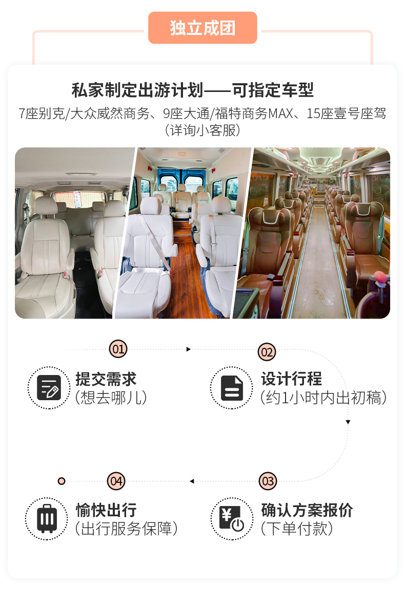 出发前一天晚上20:00到22:00导游会联系您集合的时间和地点,超过22:00未收到通知或有任何疑问请随时联系您的专属旅游顾问。页面所列集合地点和时间仅供参考,具体集合地点及时间受天气、交通、淡旺季景区流量等原因,以导游通知为准;