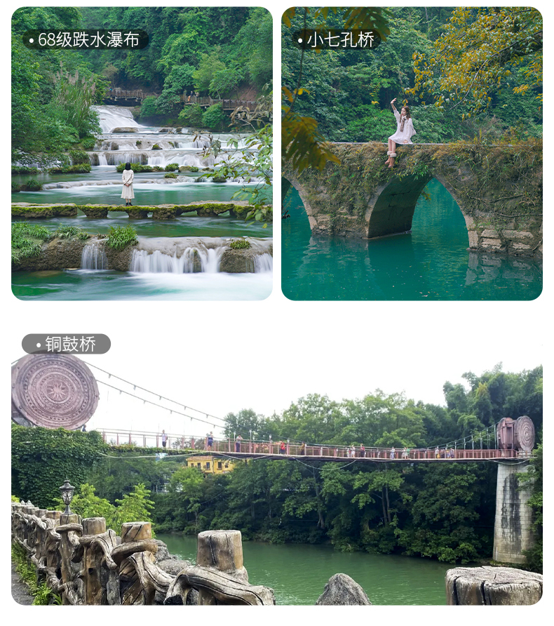 小七孔景区因一座建造于道光15年间(1836年)的小七孔石桥而得名;景区被称之为超级盆景,集山、水、洞、林、湖、瀑布等为一体 景区观光车(40元/人,景区保险10元/人)不含,敬请自理