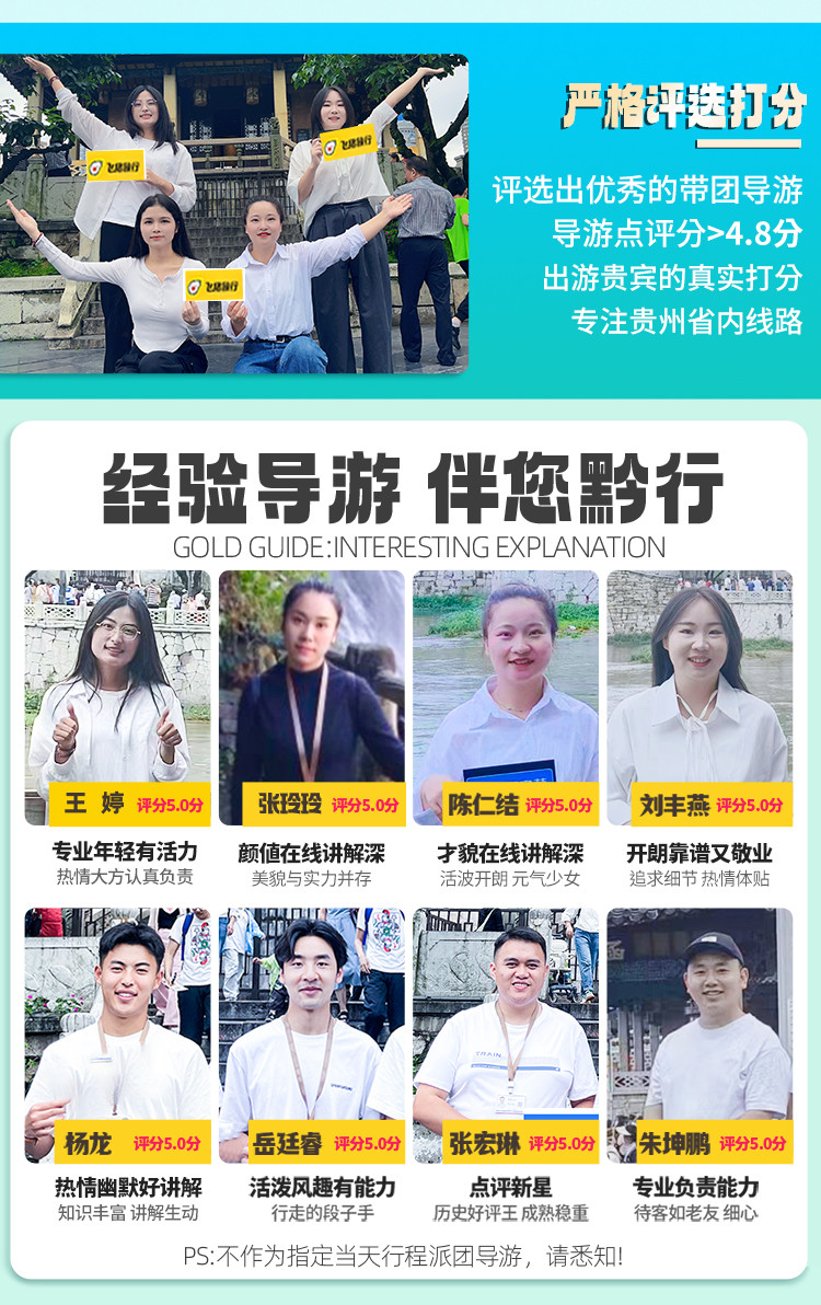 6.贵州地处云贵高原地区,山路较多,请穿轻便、柔软休闲鞋子;贵州素有天无三日晴之说,天气多雨,请自备雨伞;少数民族寄居地,请遵循当地风俗。