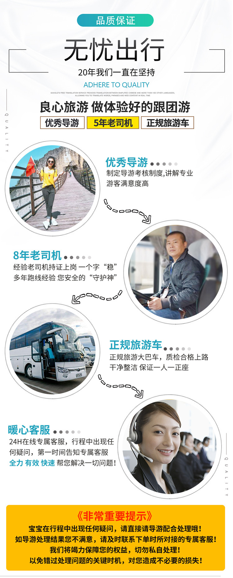 2. 导游会在出行前一天晚上21点前,短信/电话联系通知您次日具体出发时间等相关事宜,开始行程后,有任何的问题,请第一时间联系客服,我们必将竭尽全力解决问题;