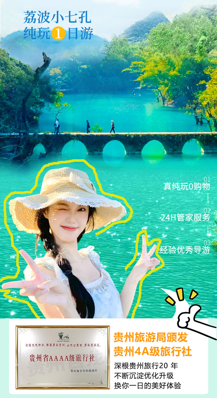 早上7点左右在贵阳延安西路32号旅游集散中心集合出发(具体时间以导游通知为准),开启一次清新润肺之旅,前往今天的目的地集湖、瀑、林、水、桥于一体的【小七孔景区】,车程约3.5小时,抵达享用午餐后游览。