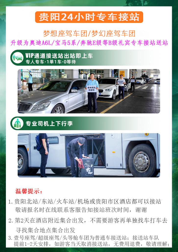 1. 该产品包含第一天贵阳站接站,出发前一天晚上19:00到22:00小车师傅会联系您接站事宜,超过22:00未收到通知或有任何疑问请随时联系您的在线客服或电话4006588799转12955,谢谢;送站为 第5天晚上19-21点之间送站师傅联系送站事宜,如未接到联系敬请联系在线客服或4006588799转12955