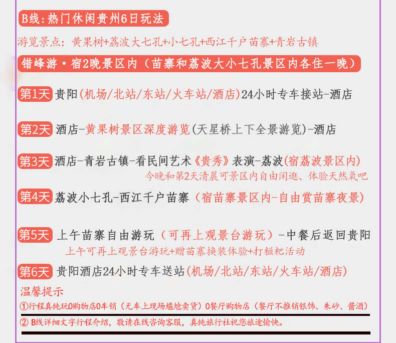 【B线】不含景区小交通费用:黄果树观光车+景区保险60元,西江电瓶车+景区保险30元,小七孔观光车+景区保险50元,天洞魔毯10元+出景区电瓶车5元,以上费用必须产生,团费不含,敬请自理;黄果树大扶梯单程29元、往返50元,鸳鸯湖划船30元(自愿选择乘坐,费用自理);