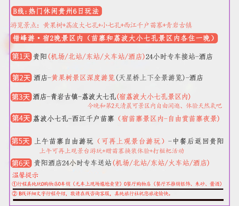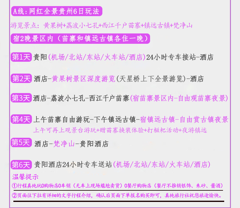 7:页面行程为6天5晚(包含到达贵阳当天接站和住宿及第5天晚上回到贵阳住宿第6天送站费用),如游客需要自行安排贵阳住宿到达和离开,可报我家【真纯玩旅行社店铺】内4天3晚行程,在线咨询客服单独发4天3晚行程链接哦,谢谢;