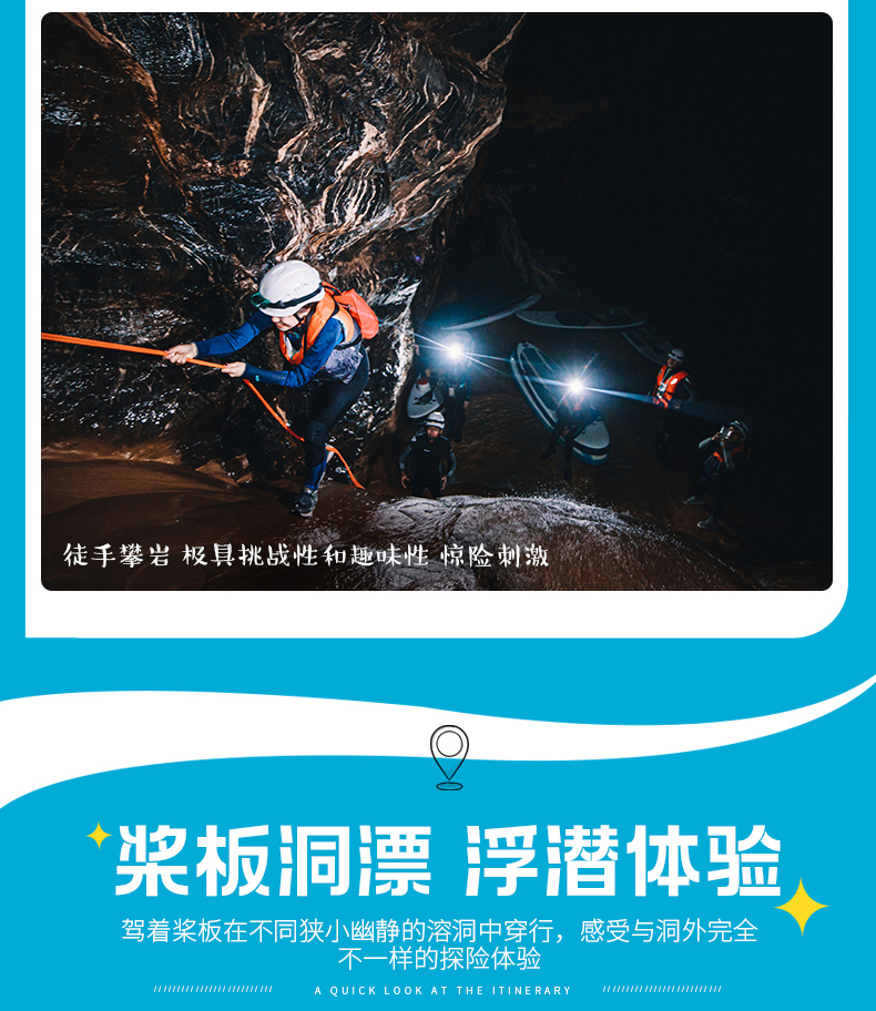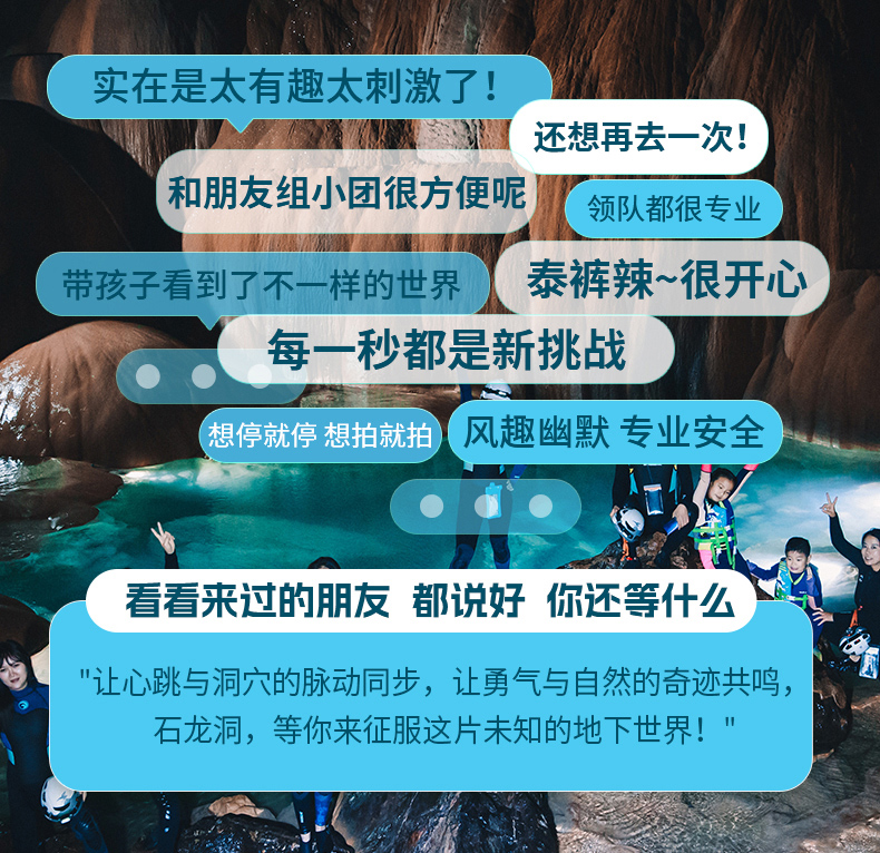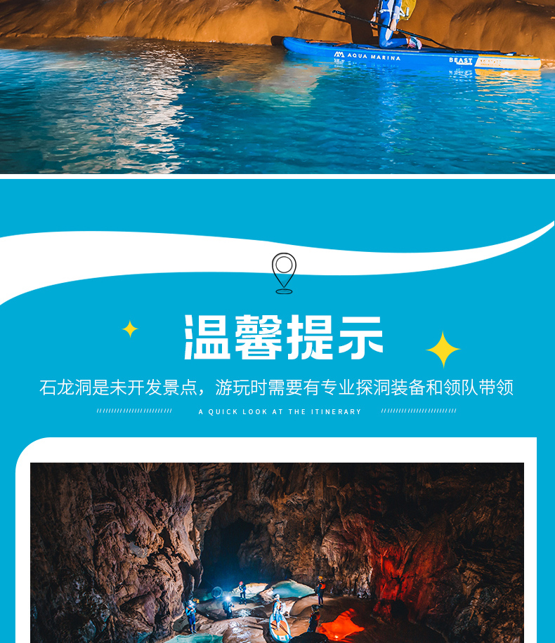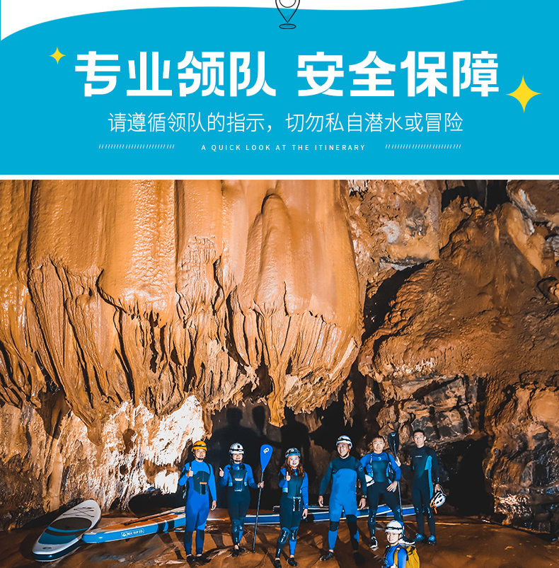 1.户外探洞活动不同于传统旅游,具有一定的危险性,要求参与者身体健康、无重大疾病史、非孕妇、无传染性疾病等,因此参加者须对自己的安全负责,对自身情况和活动要求做好充分评估,并充分告知客服自身身体状况,查看风险告知书,签署免麦声明;如代他人报名请务必核实基情况;未成年人必须有监护人陪同方可参加活动,并有监护人对其负责。