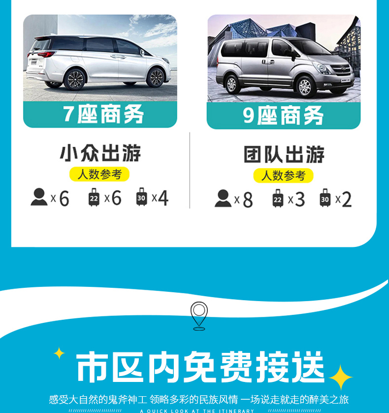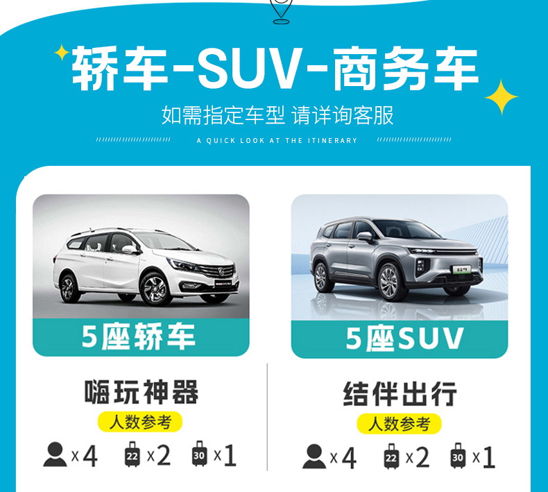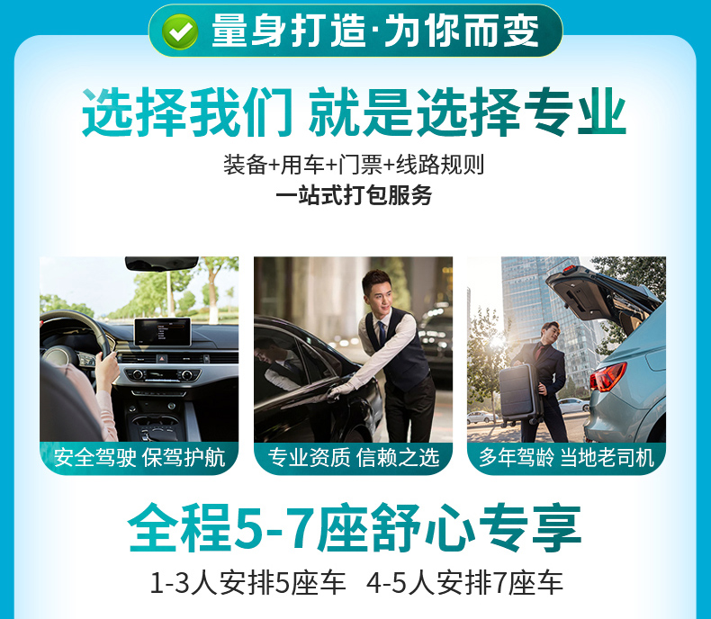 根据参团人数调派车型,保证一人一正座