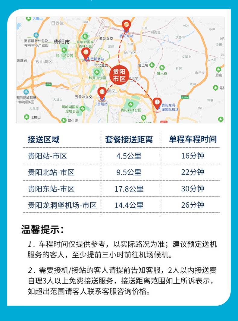 接送:贵阳市区1.5环免费接送。