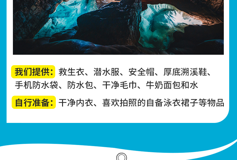 到达最美水潭,布灯拍摄绝美出圈美照 PS:内里可以穿浅色系贴身泳衣,到达打卡地可以脱掉装备,拍摄美美的出圈照片