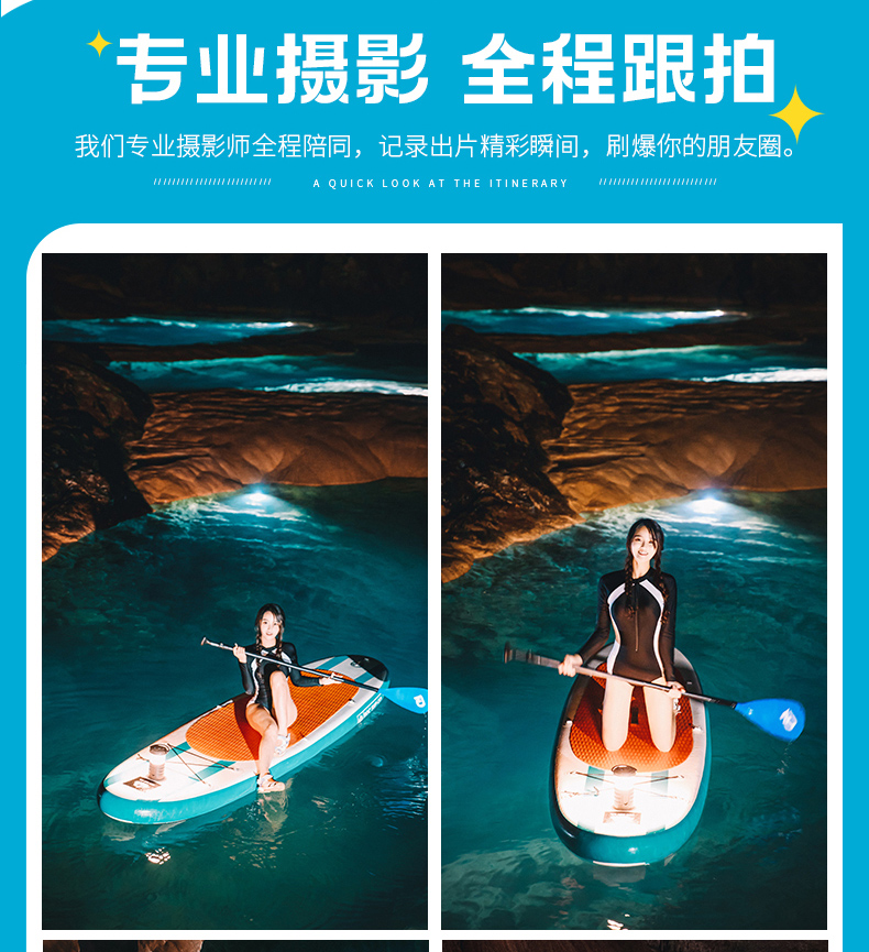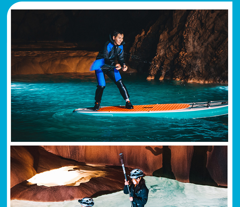 装备:桨板、头盔、头灯、潜水服(湿衣)、救生衣、防水背包、手机防水袋。