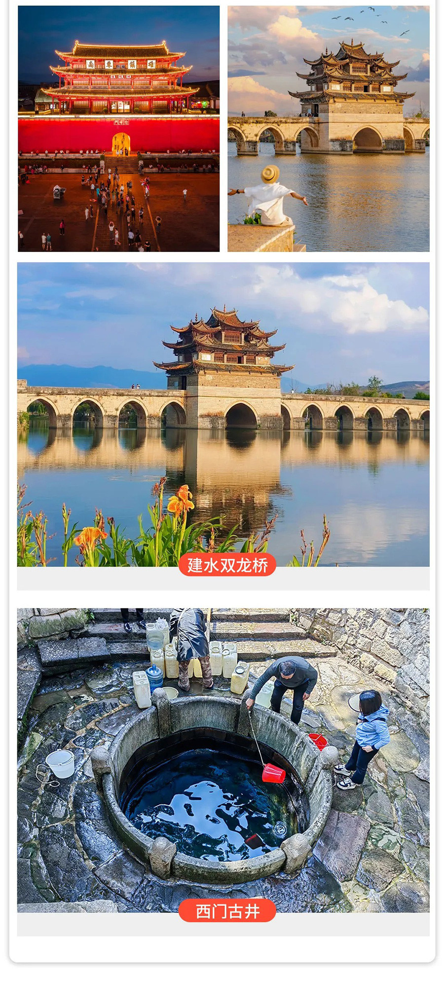 之后乘车抵达建水【西门古井】建水的古井很出名不但数目众多,而且造型奇特,五花八门。适时我们前往观看【朝阳楼外景】,600多年的朝阳楼,以元朝建筑、明朝建筑相结合,建筑雄伟壮观