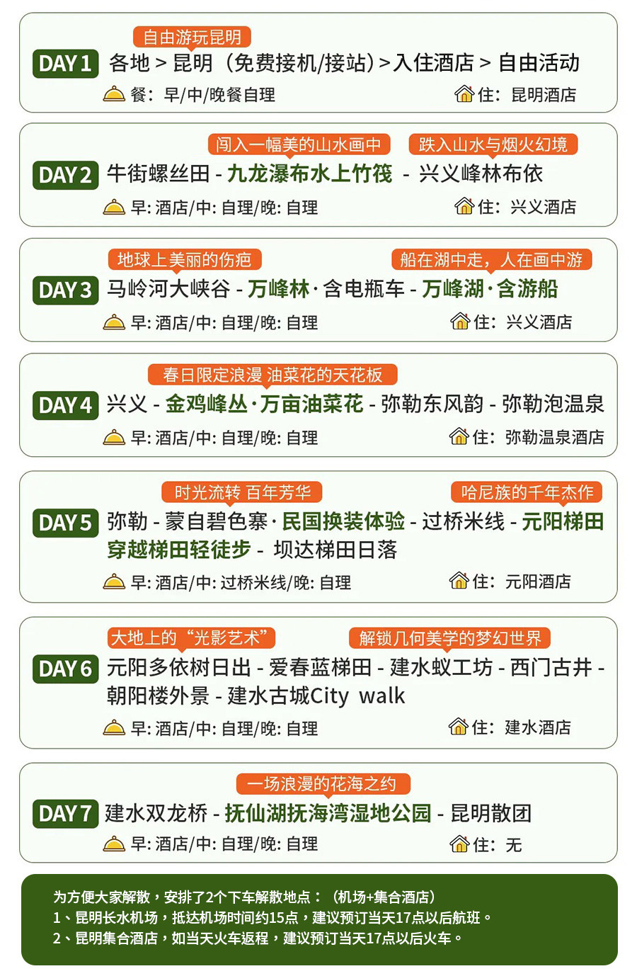 适时乘车返回昆明,为方便大家解散,安排了2个下车解散地点:(机场+集合酒店) 1、昆明长水机场,抵达机场时间约15点,建议预订当天17点以后航班。 2、昆明集合酒店,如当天火车返程,建议预订当天17点以后火车。