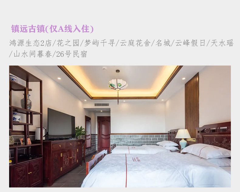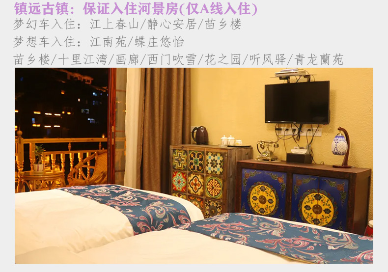镇远古镇参考酒店: 梦幻车入住:江上春山/静心安居/苗乡楼; 梦想车入住:江南苑/蝶庄悠怡; 壹号车/超级车/头等舱车入住:苗乡楼/十里江湾/画廊/西门吹雪/花之园/听风驿/青龙蘭苑;