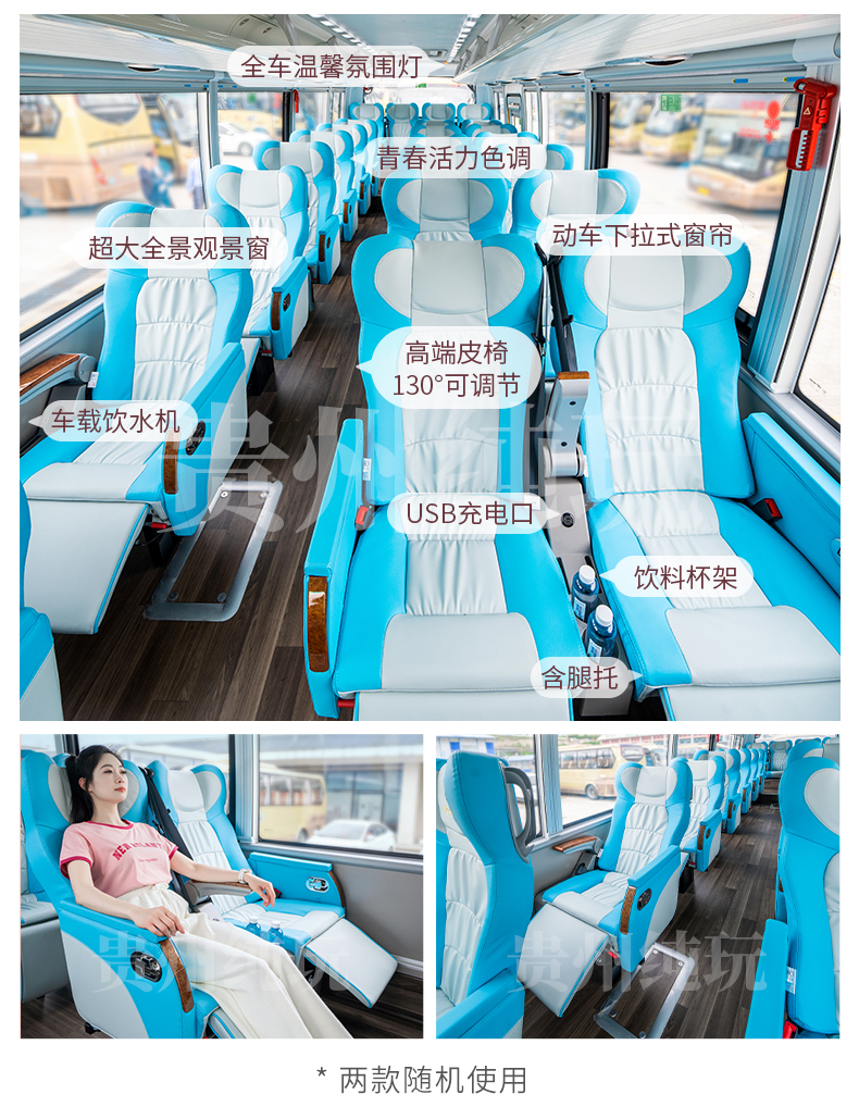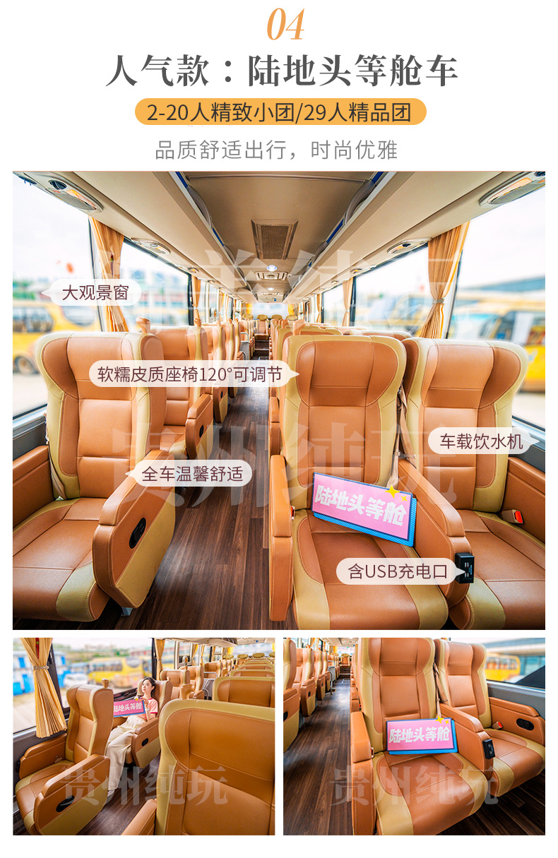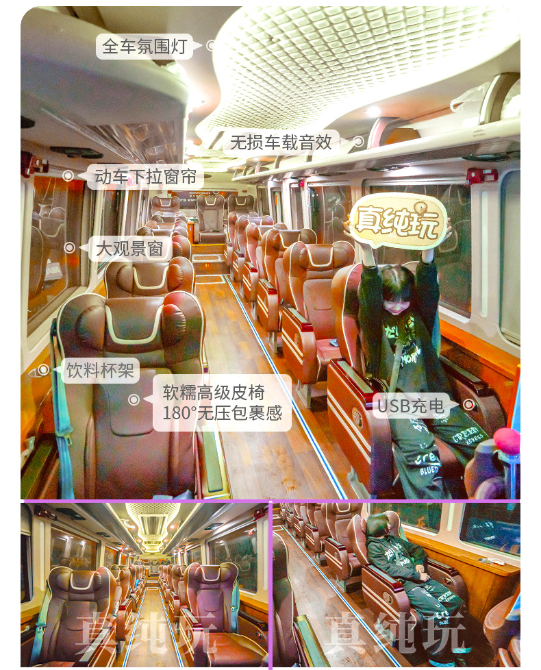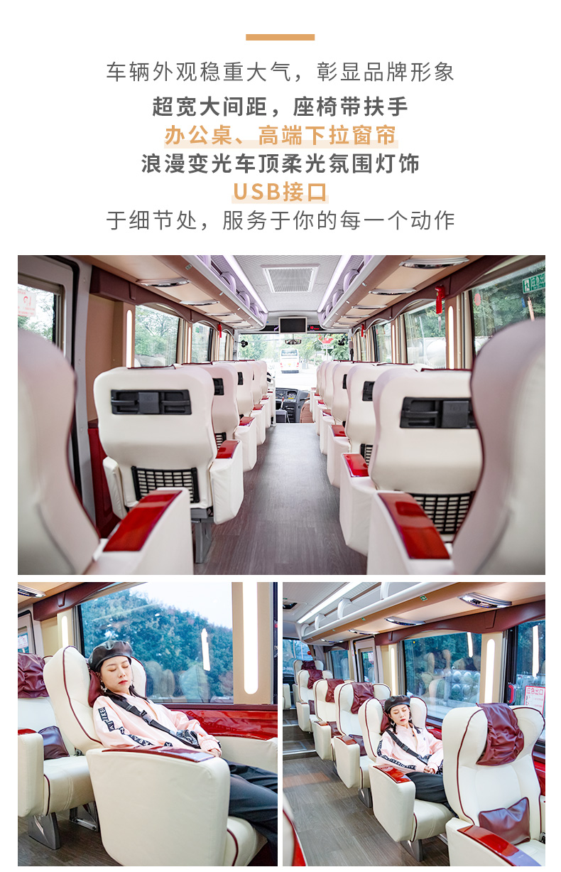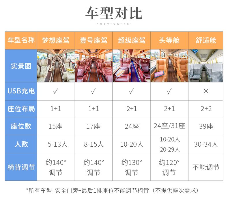 头等舱车:为页面展示一排仅3座,24-37座车,车身为39-49座长度,舒适宽敞,最后一排为4座;此车最后一排和安全门座椅固定,无法平躺;