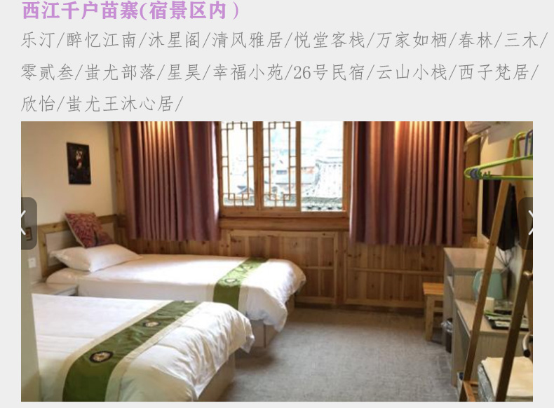 苗寨内参考客栈: 乐汀/醉忆江南/悦堂/西子梵居/春林/清风雅居/沐星阁/零贰叁/星昊/三木/万家如栖/欣怡/蚩尤王沐心居/云山小栈/26号民宿/蚩尤部落/苗镜隐山/上云栖/幸福小苑/望月;