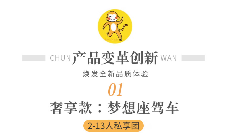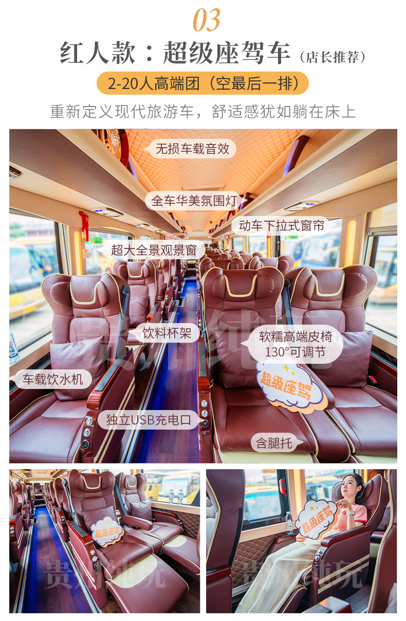 超级座驾车:为页面展示1排3座,最后一排为4座,有腿托,舒适宽敞,空最后一排不乘坐游客,此车最后一排和安全门座椅固定,无法平躺;