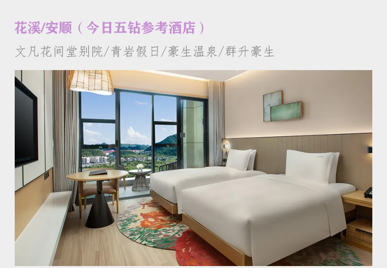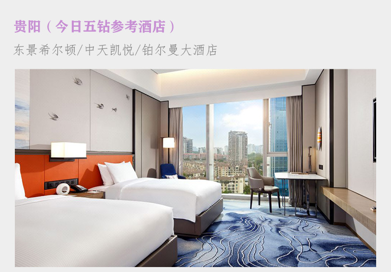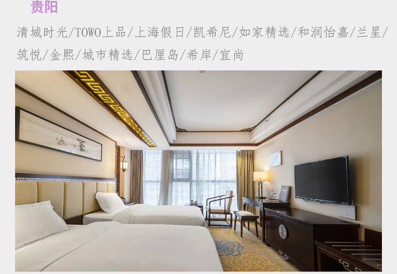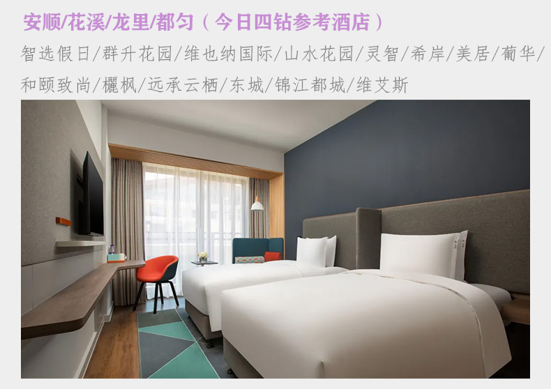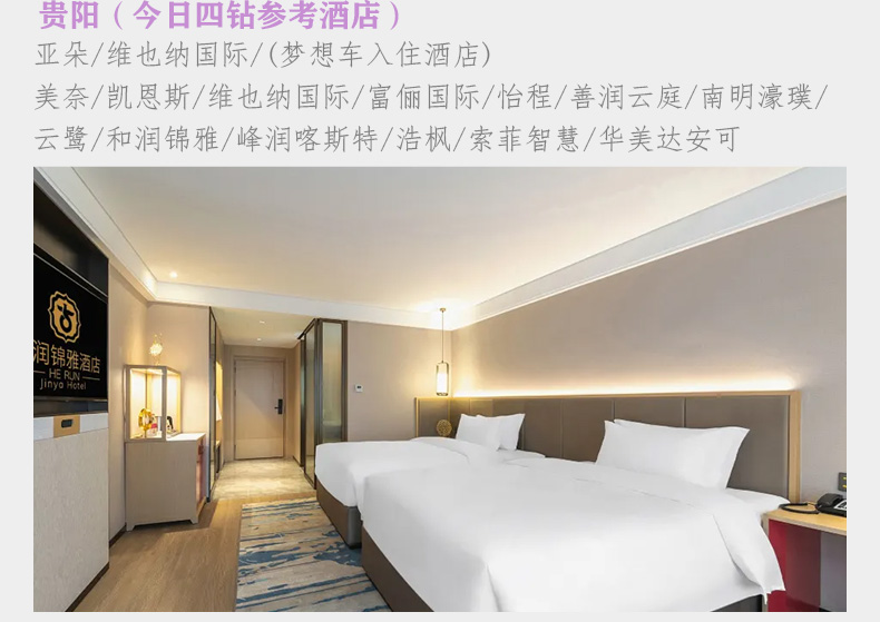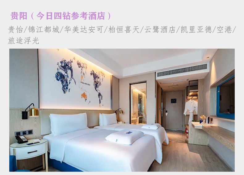 参考酒店(今日均为四钻酒店): 智选假日/群升花园/维也纳国际/山水花园/灵智/希岸/美居/葡华/和颐致尚/欐枫/远承云栖/东城/锦江都城/维艾斯 【今日可能入住贵阳花溪龙里都匀安顺等】