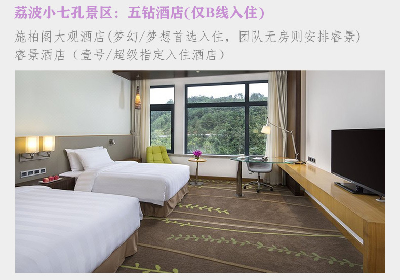 3. 酒店说明:贵州普遍经济水平落后,住宿硬件和软件条件都有限,请不要以城市的标准来衡量,敬请谅解!行程中提到的酒店名称,为经济舒适型住宿,是非国家旅游局授牌的星级酒店,仅指旅行社行业内部评称,特别告知!同等级酒店的设施因地区不同而有较大差距,遇特殊原因(如天气,交通,地面,酒店接待能力),可能变更住宿地点,客人不可指定住任何酒店,须随团安排,标准不变。2人及以下出行(1大,1大1小,2大要求分房的,)必须补房差。3人以上可补房差(三人睡一间房可退房差百分之50),旅行社不在行程中提供自然单间和拼房服务,亦不接受楼层及特殊房型指定(房间默认安排标间双床如需大床下单备注尽量安排);因计划用房,房差需于出行前团款中付清;行程内酒店住宿押金均为客人自付自退。