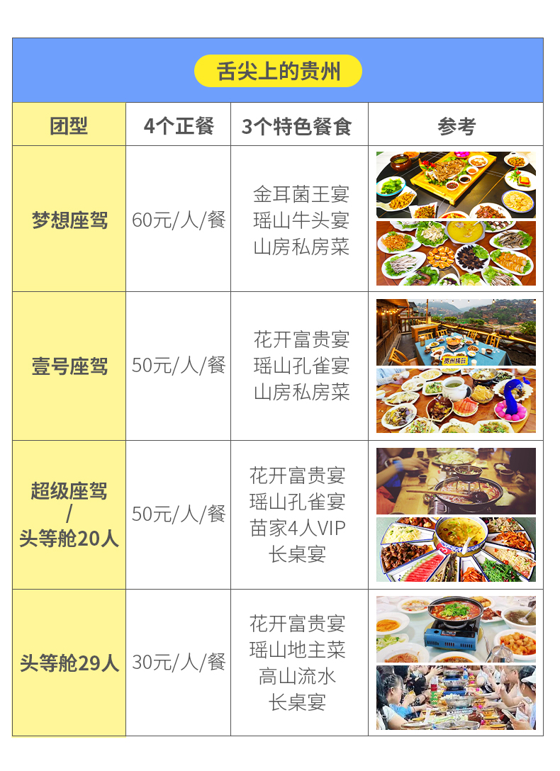 头等舱车20人团/超级座驾车团/壹号座驾车团正餐餐标:成人50元/人,儿童25元/人;
