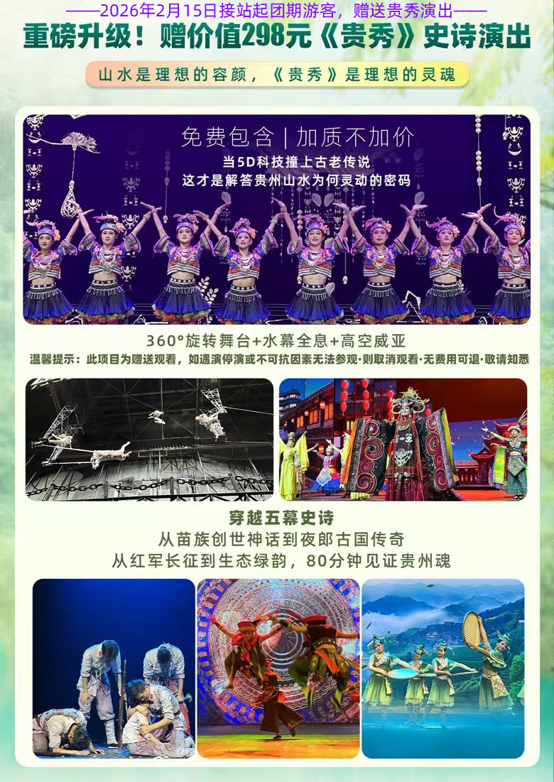 2026年2月15日接站起团期游客,B线行程升级赠送民间艺术《贵秀》表演观看,2026年2月15日接站之前团期无《贵秀》演出观看赠送,敬请理解;赠送贵秀演出行程后,按以下行程顺序游玩,景点不变,荔波景区游览顺序稍有变化;