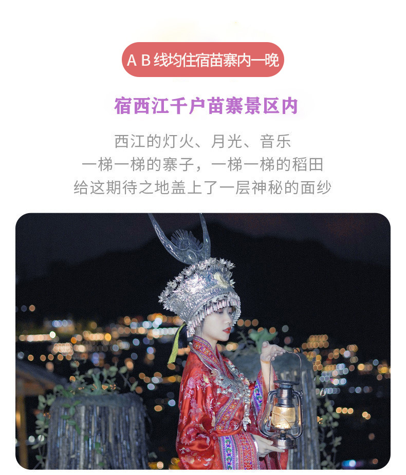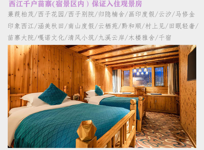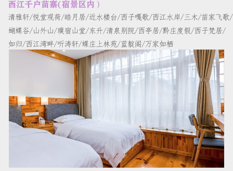 2.西江均为民俗客栈,空调,热水器均具备,但是和城市同等级别的酒店有差距。且单家客栈房间数量较少,一个散拼团可能会出现分1-2家客栈住宿,进入景区无行李车,需要自行携带行李步行(10-20分钟)进入景区入住酒店(建议将大件行李存放车上,仅携带贵重物品以及必备洗漱品进入景区)