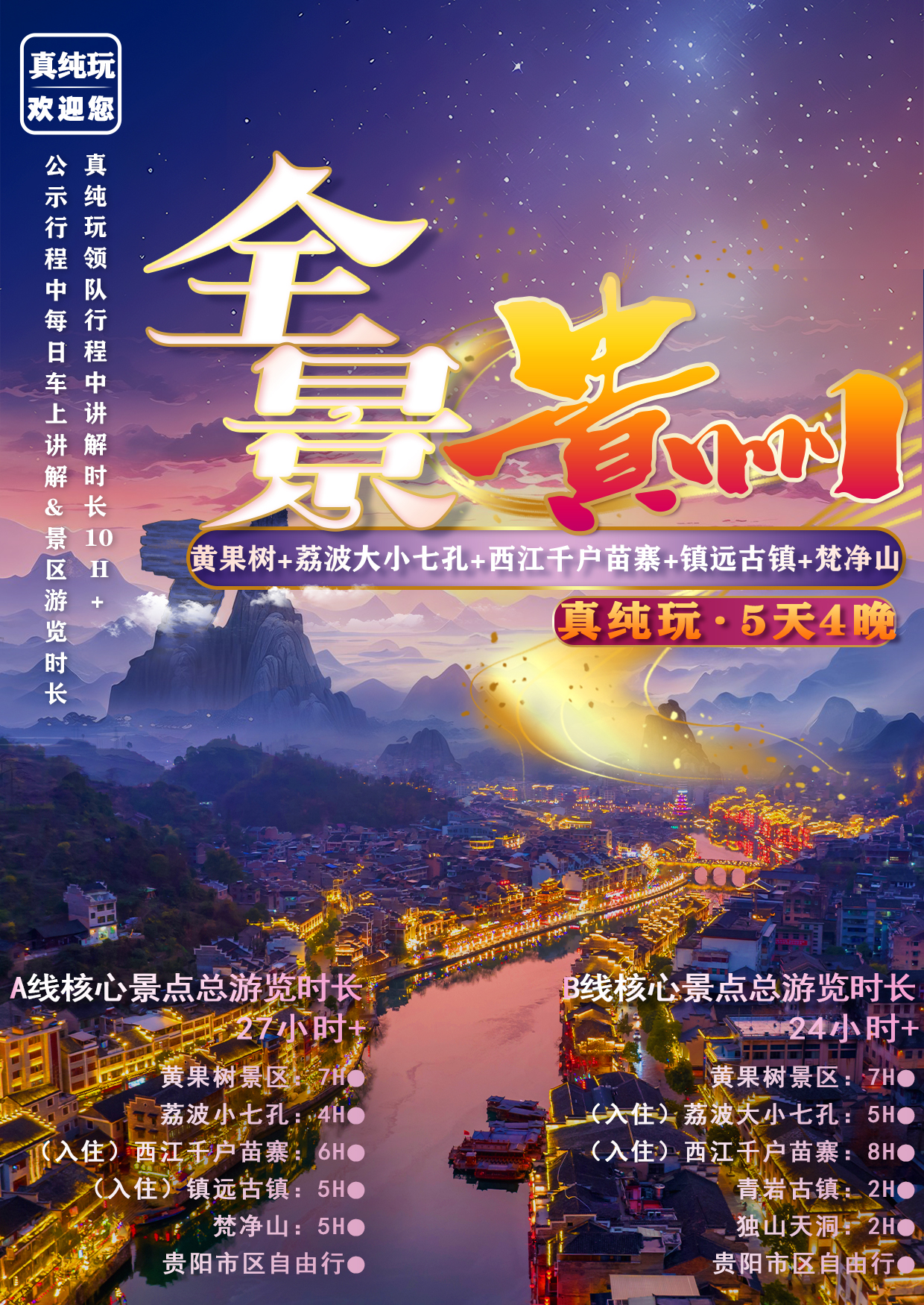 【A线】含黄果树门票+荔波小七孔门票+西江千户苗寨门票+梵净山门票,镇远古镇无门票;持景区认可优免证件,下单页面免票套餐,团上不再退免票门票费用;