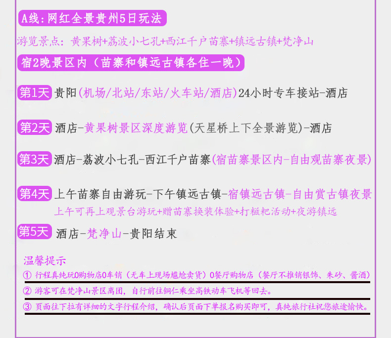 页面展示行程路线为【A线:网红全景贵州5日游】的详细行程介绍,如需【B线:热门休闲贵州5日游】的行程路线文字介绍,敬请在线咨询客服发您,谢谢;