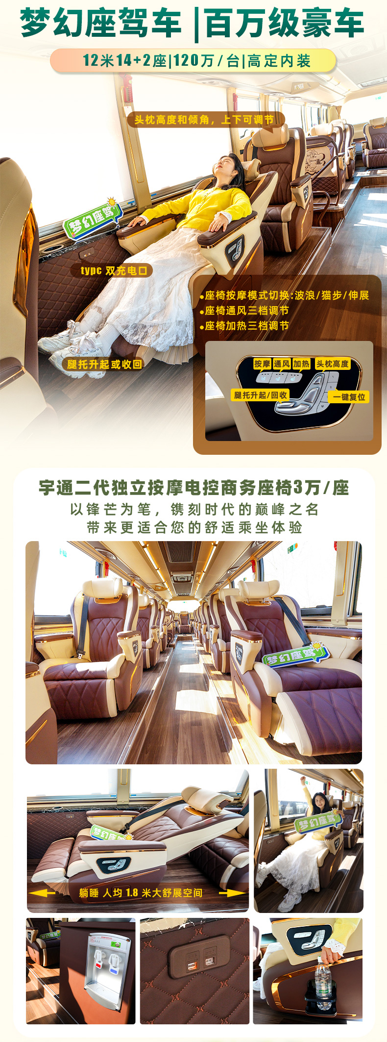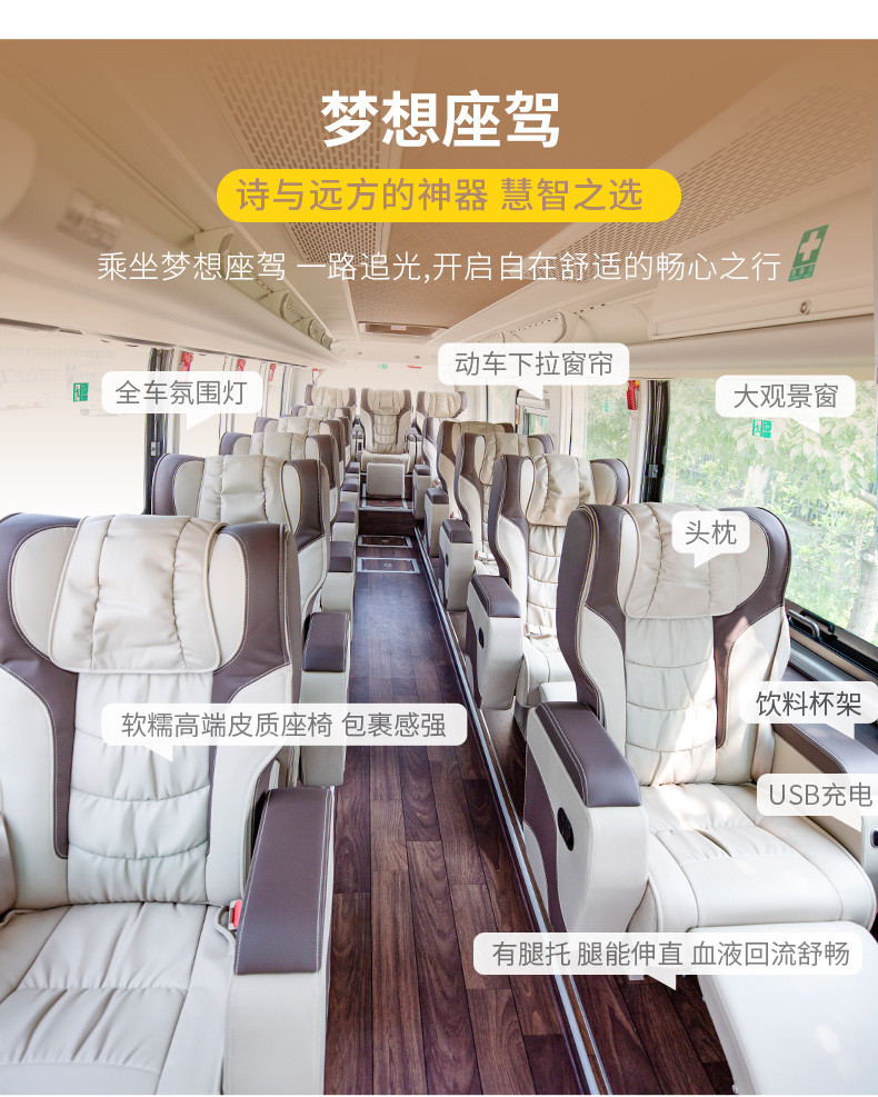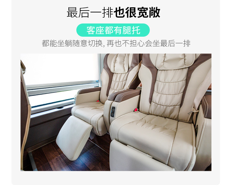 梦想座驾车:为页面展示1排仅2座,15座车,车身为39座长度,有腿托,舒适宽敞,最后一排为3座;