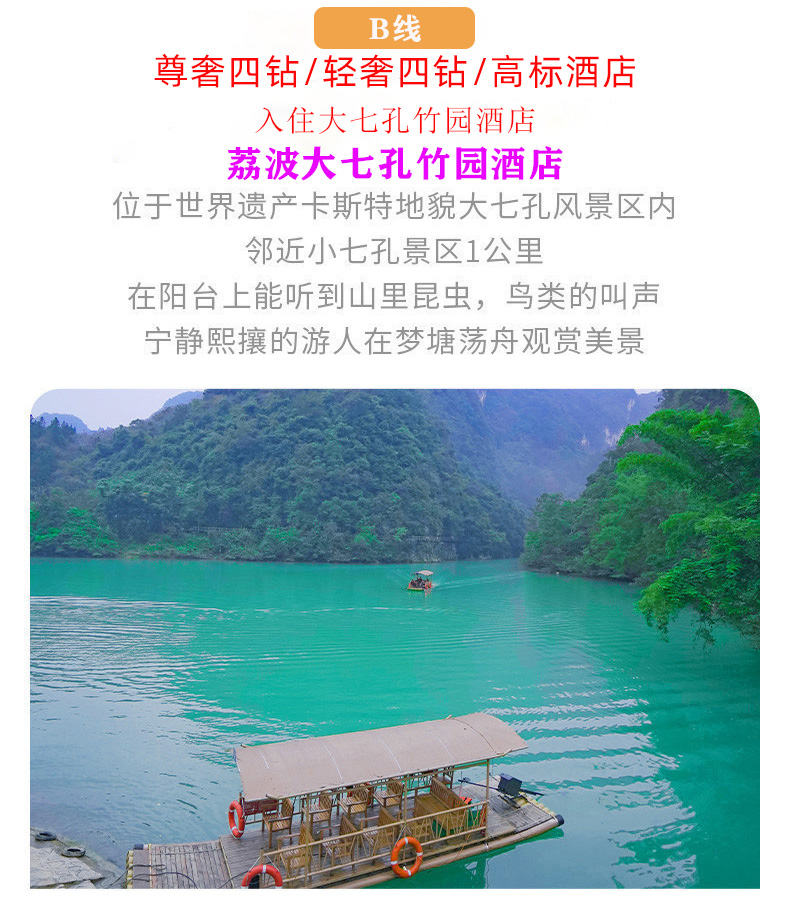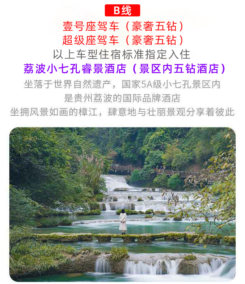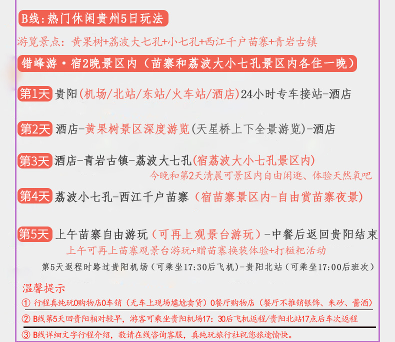 【B线】不含景区小交通费用:黄果树观光车+景区保险60元,西江电瓶车+景区保险30元,小七孔观光车+景区保险50元,青岩古镇观光车25元,天洞 10元魔毯 5元电瓶车 以上费用必须产生,团费不含,敬请自理;黄果树大扶梯单程29元、往返50元,鸳鸯湖划船30元(自愿选择参加);