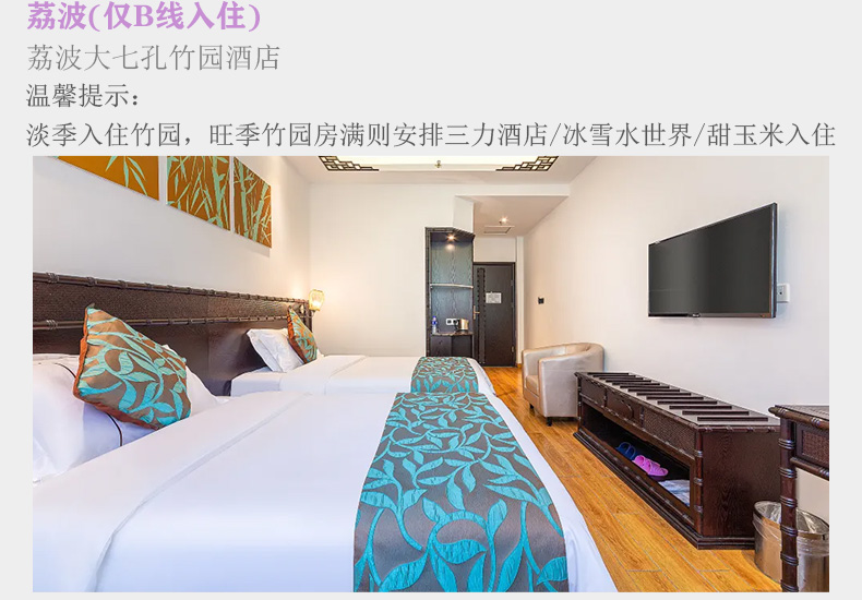 普标型、高标型、轻奢四钻住宿可保证单人可拼房,拼不了时也无需补单人房差。 如2人同行都需拼房或者一大人带儿童则需补1个房差 所有套餐均无三人间,3人可补单人房差,住2间房房,也可住一个标间则退房差的50%,含3人早餐,若含2人早餐,则退100%单人房差。