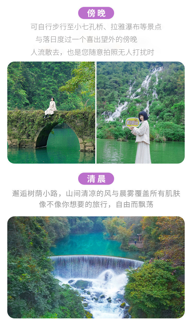 【B线】含黄果树+荔波大小七孔+西江千户苗寨门票,青岩古镇为旅行社团队奖励免票;持景区认可免票证件,页面下单报名免票套餐,团上不再退免票门票费用;