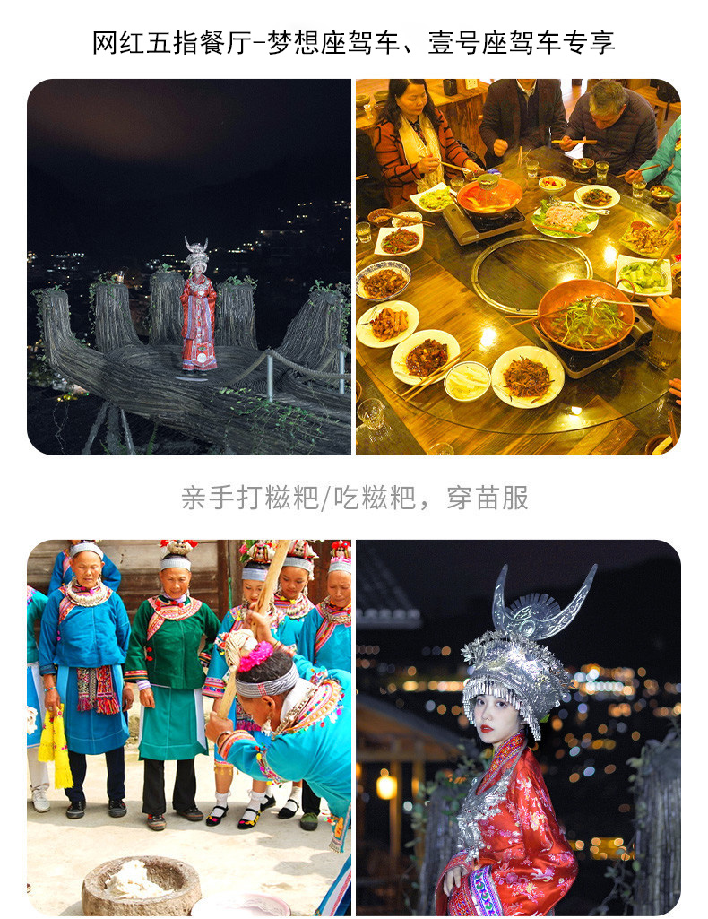 长桌宴是苗族宴席高形式与隆重礼仪,席间接受苗家少女飞歌敬酒,感受着浓郁而古朴的少数民族风情 畅饮高山流水苗家米酒,享受苗族人高礼仪的贵宾接待 温馨提示:壹号座驾车无此活动,为五指网红餐厅用餐