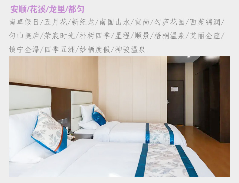 参考酒店(今日均为三钻酒店): 南卓假日/五月花/新纪龙/南国山水/宜尚/匀庐花园/西苑锦润/匀山美庐/荣宸时光/朴树四季/星程/顺景/梧桐温泉/艾丽金座/镇宁金瀑/四季五洲/妙栖度假/神骏温泉;