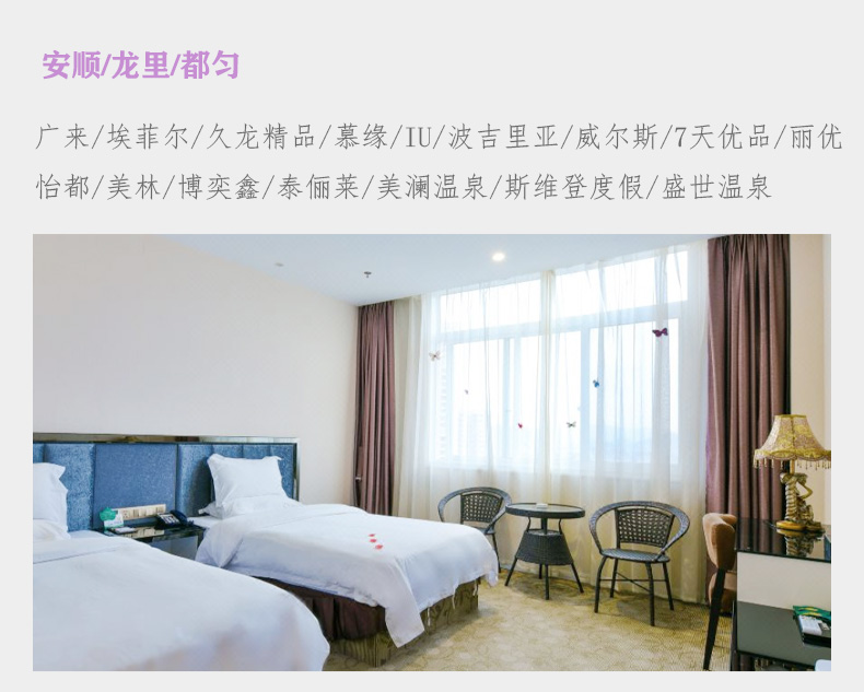 参考酒店: 广来/埃菲尔/久龙精品/慕缘/IU/波吉里亚/威尔斯/7天优品/丽优怡都/美林/博奕鑫/泰俪莱/美澜温泉/斯维登度假/盛世温泉
