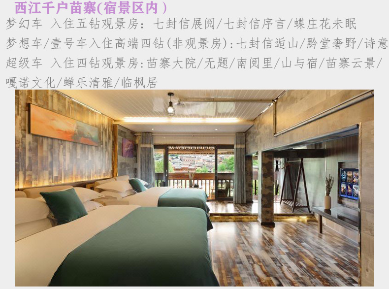 苗寨内参考客栈: 梦幻车 入住五钻观景房:七封信展阅/七封信序言/蝶庄花未眠; 梦想车/壹号车入住高端四钻(非观景房):七封信逅山/黔堂奢野/黔堂诗意; 超级车 入住四钻观景房:苗寨大院/无题/南阅里/山与宿/苗寨云景/嘎诺文化/蝉乐清雅/临枫居;