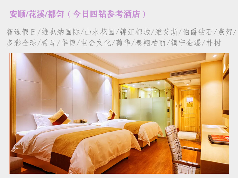 参考酒店(今日均为四钻酒店): 智选假日/维也纳国际/山水花园/锦江都城/维艾斯/伯爵钻石/燕贺/多彩全球/希岸/华博/屯舍文化/葡华/泰翔柏丽/镇宁金瀑/朴树