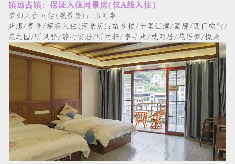 镇远古镇参考酒店: 梦幻入住五钻(观景房):山河事; 梦想/壹号/超级入住(河景房):苗乡楼/十里江湾/画廊/西门吹雪/花之园/听风驿/静心安居/听雨轩/李寻欢/枕河居/花语梦/悦来;