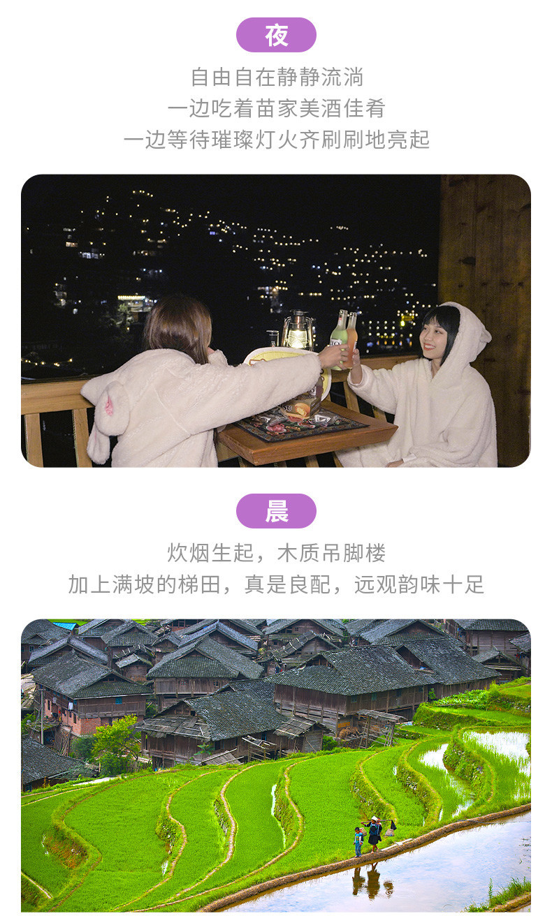 到达苗寨后,办理完入住手续后,自由参观,参观原始的民族建筑,吊脚楼群、苗寨梯田,深入苗寨,走家串户,了解苗家人的生活以及风俗习惯。 温馨提示: 旺季可能会晚到,敬请理解