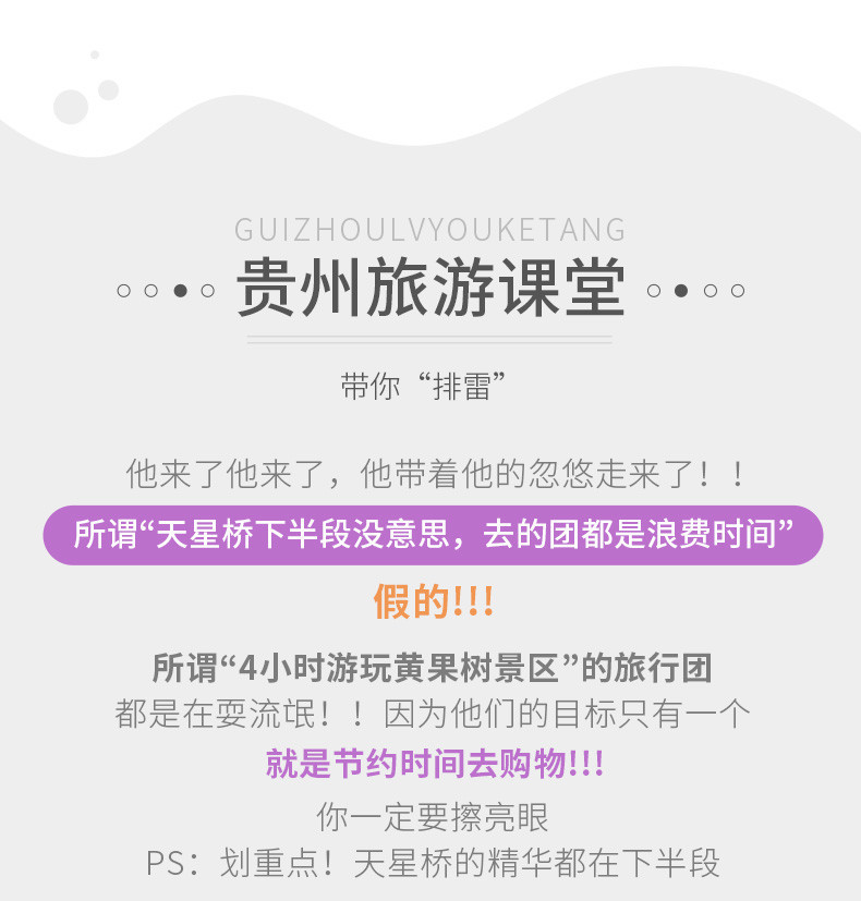 1、贵州地处云贵高原地区,山路较多,请穿轻便、柔软休闲鞋子,素有天无三日晴之说,天气多雨,请自备晴雨伞,景区经常有雨雾天气、及冬天雪地路滑,请注意踩稳,行走不宜过快,小心慢行