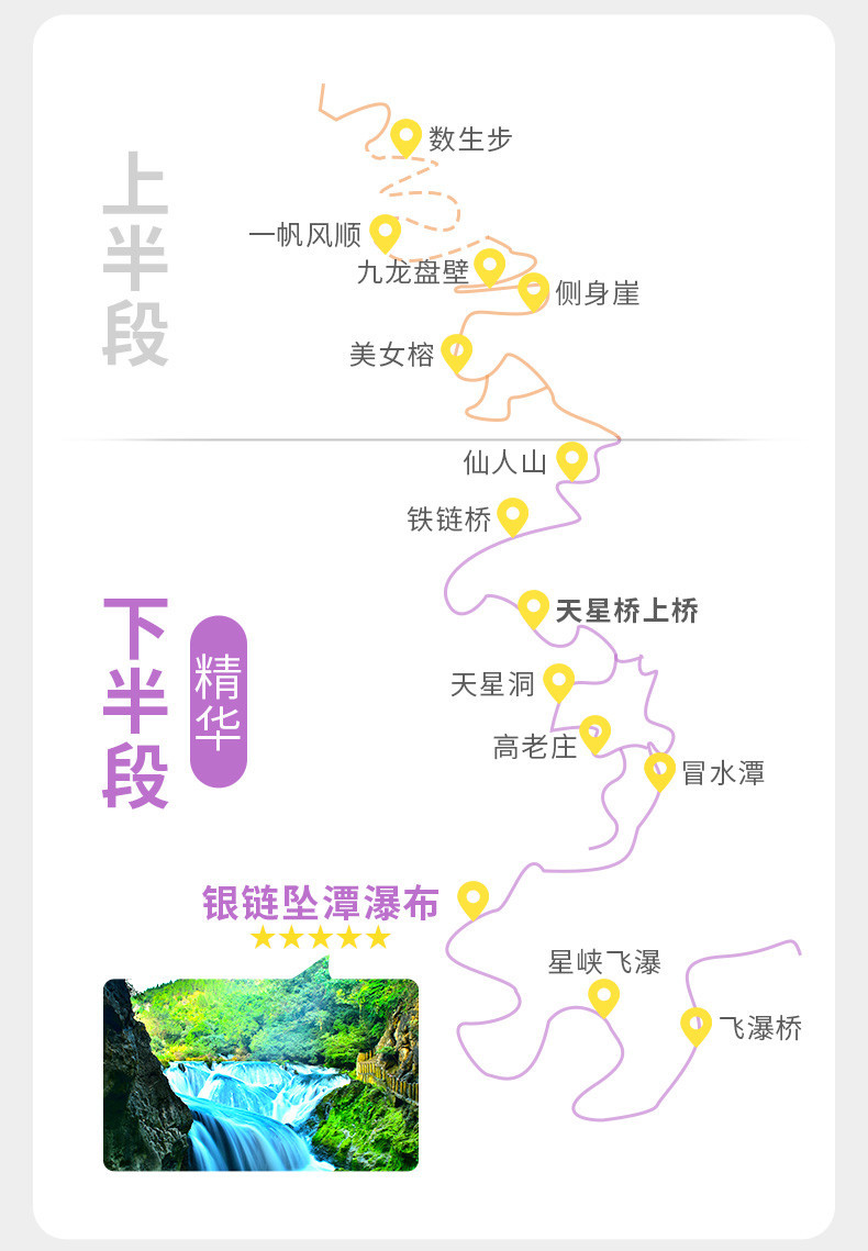 景区有喀斯特水上石林之称,这里顽石突兀而起,星罗棋布,一路欣赏高老庄天星湖、喀斯特溶洞奇观天星洞、小白龙的冒水潭、水上石林、天星桥上桥、飞瀑桥等著名景观;游览美轮美奂的银链坠潭瀑布,堪称景区优美瀑布