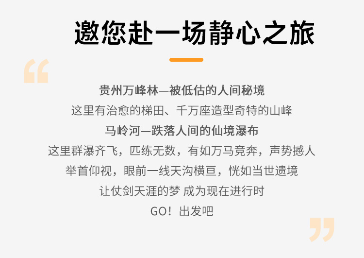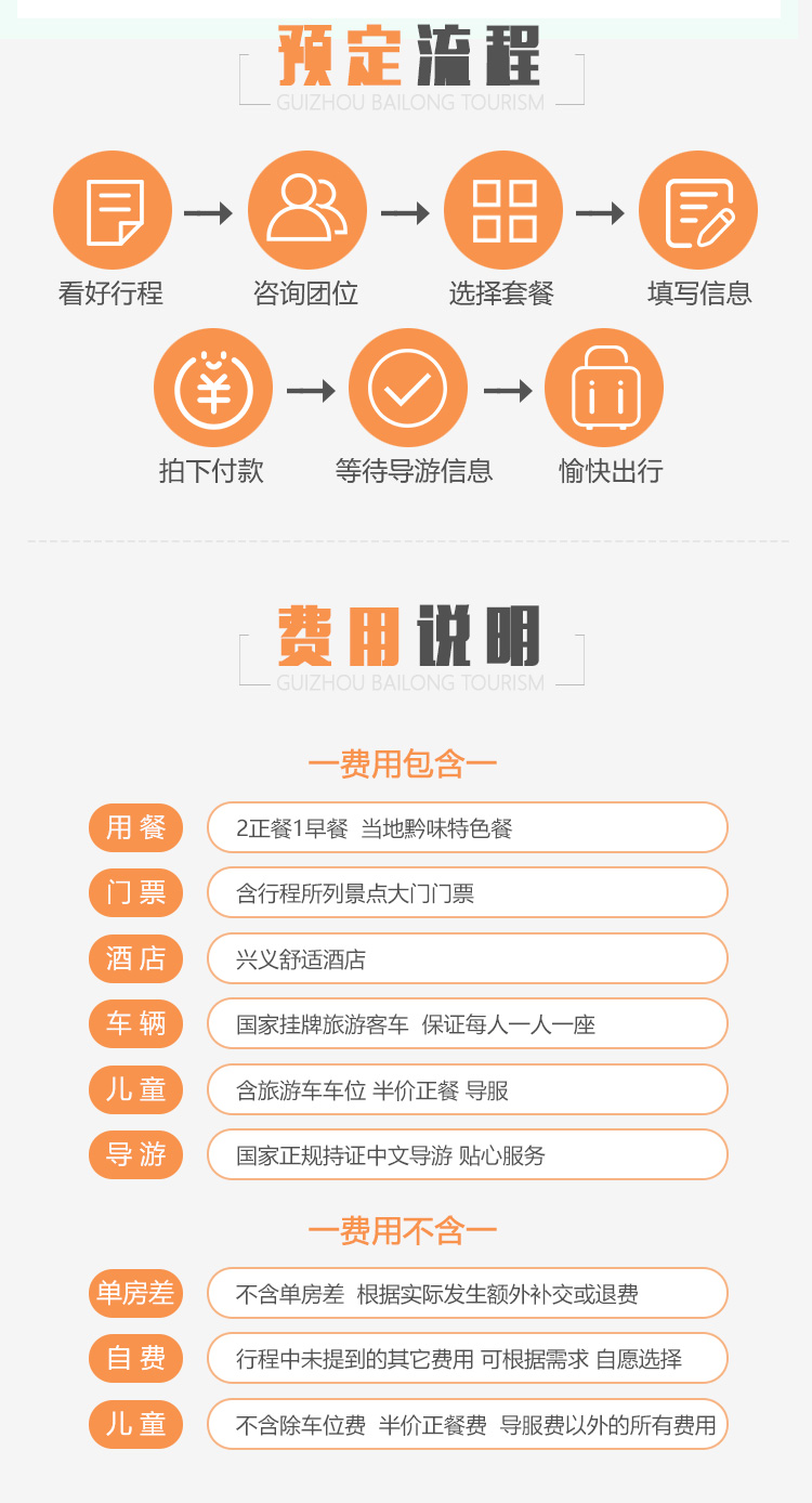 7.贵州地处云贵高原地区,山路较多,请穿轻便、柔软休闲鞋子;贵州素有天无三日晴之说,天气多雨,请自备雨伞;少数民族寄居地,请遵循当地风俗。